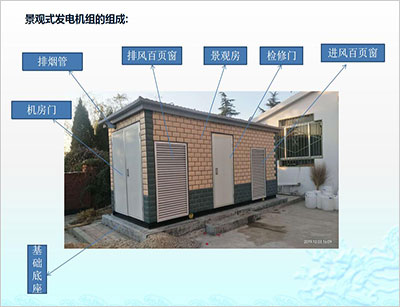 景觀式機(jī)組(普通型、靜音型):適用于小區(qū)、公園、醫(yī)院以及其它辦公廠所。墻體為混凝土預(yù)制板、門(mén)窗為鋁合金材質(zhì),外觀仿建筑造型,與周圍環(huán)境融為一體。可以設(shè)計(jì)成底盤(pán)油箱或者獨(dú)立油箱。