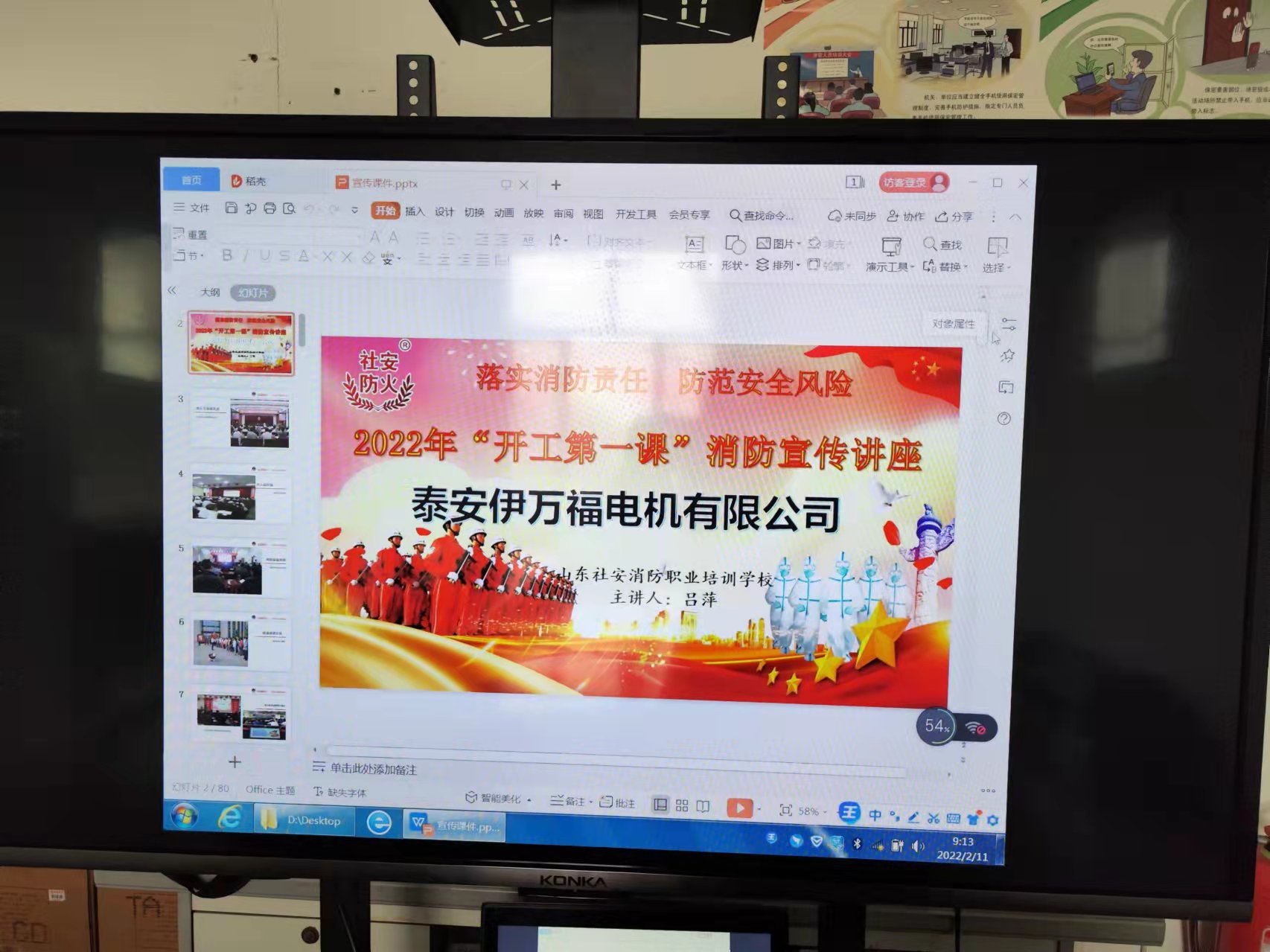 2022年 2月11日,泰安伊萬福發(fā)電機(jī)公司開展了2022年“開工第一課”消防宣傳講座,山東社安消防職業(yè)培訓(xùn)學(xué)校呂老師以生動的方式講敘了多種情況下的火災(zāi)現(xiàn)場及其滅火方法等,不但掌握了一些消防安全工作的基本理論知識,還給我們的生活習(xí)慣帶來了一點(diǎn)提醒。
